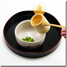 1碗に1客分3杓程度の分量で抹茶を掬出し、湯を注ぎ、茶筅で練ります。 季節のお菓子と共にどうぞ。