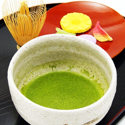 1碗に1客分3杓程度の分量で抹茶を掬出し、湯を注ぎ、茶筅で練ります。 季節のお菓子と共にどうぞ。