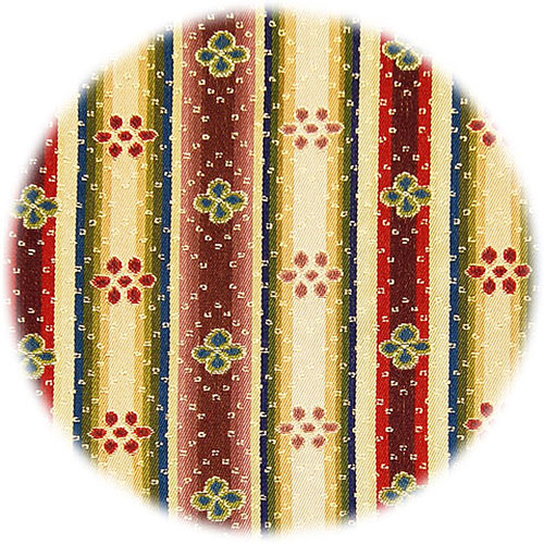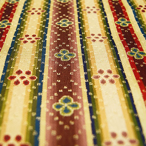 紫、赤の縦縞に緑の四弁花、白の縦縞には紫と赤の六弁花を配し、目交文様は全面に織出され、往時の感覚をそのまま伝える華麗な暈繝錦であります。